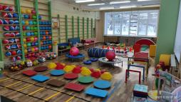 Физкультурный зал оснащен современными спортивными материалами и оборудованием: гимнастическая стена, щит баскетбольный, батут, корзины для мячей, мячи резиновые, скакалки, ходунки на веревке, кубы разного размера, скамейки гимнастические, маты гимнастические, разметочные фишки, мешочки с грузом, тоннель для подлезания, мостик- лесенка, нагрудники для командной игры, стойки для прыжков в высоту, индивидуальные коврики для ОРУ, султанчики, мишени разные, флажки, кегли. Предназначен для организации двигательной образовательной деятельности, физического развития детей, проведения физкультурных занятий, утренней гимнастики, подгрупповых и индивидуальных занятий, спортивных соревнований, праздников и развлечений.