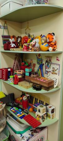 Уголок музыкального развития - аккордеоны, барабан, губная гармошка, тарелки, трещотка деревянная и др.